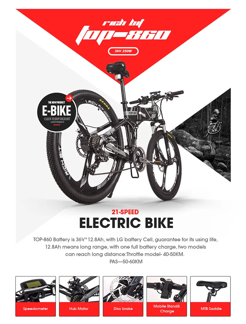The Richbit RT-860 Electric bike Bicycle Mountain Electric Bicycle 36V*250W 12.8Ah Lithium Battery EBike Inside Li-on Battery ebike was built with people like you in mind. Something to keep you happy. Every. Single. Day.